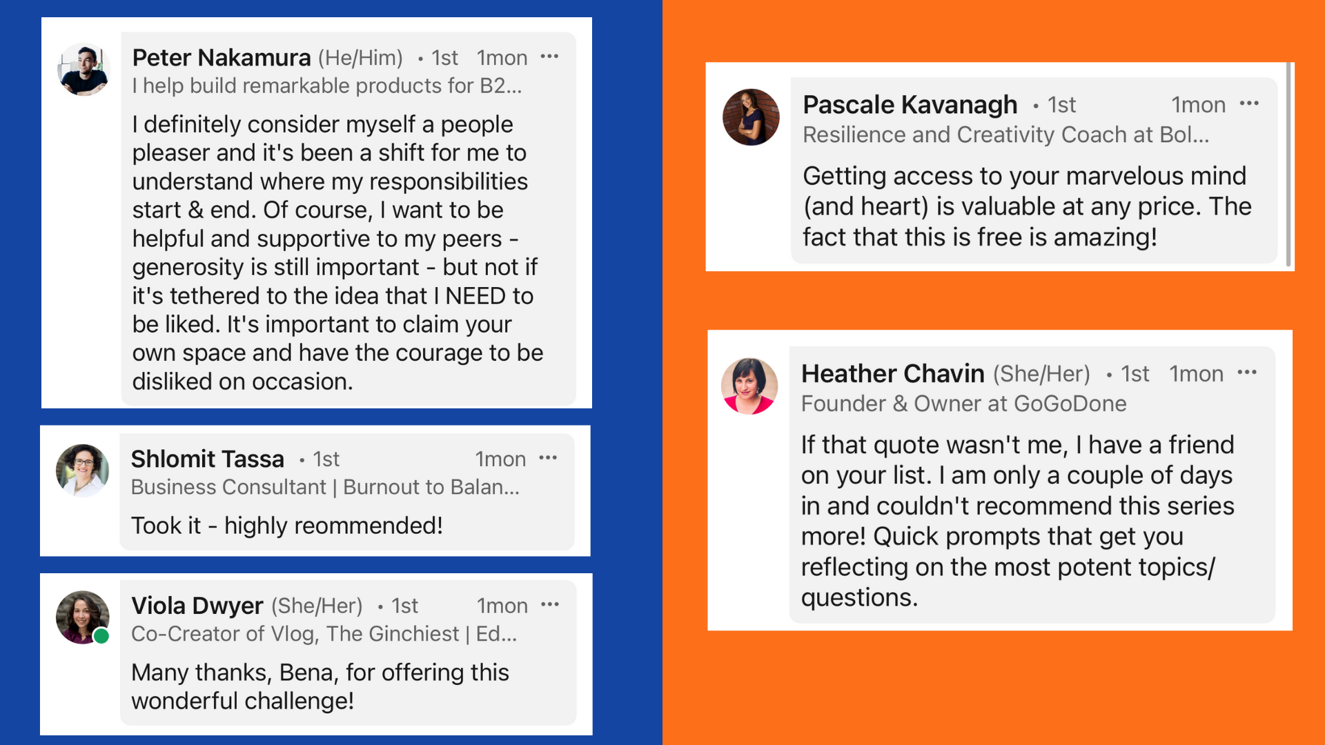 “As I began the ‘7 Days to Better Work Relationships’ Program there were people I began thinking about and my relationships with them. As I end the 7 Days, I am focused on my relationship with me. The insight is how I interact with me impacts how I interact with everyone else. Being present and aware of how I am thinking about myself and what I want is where I can begin. Thank you, Dr. Bena.””